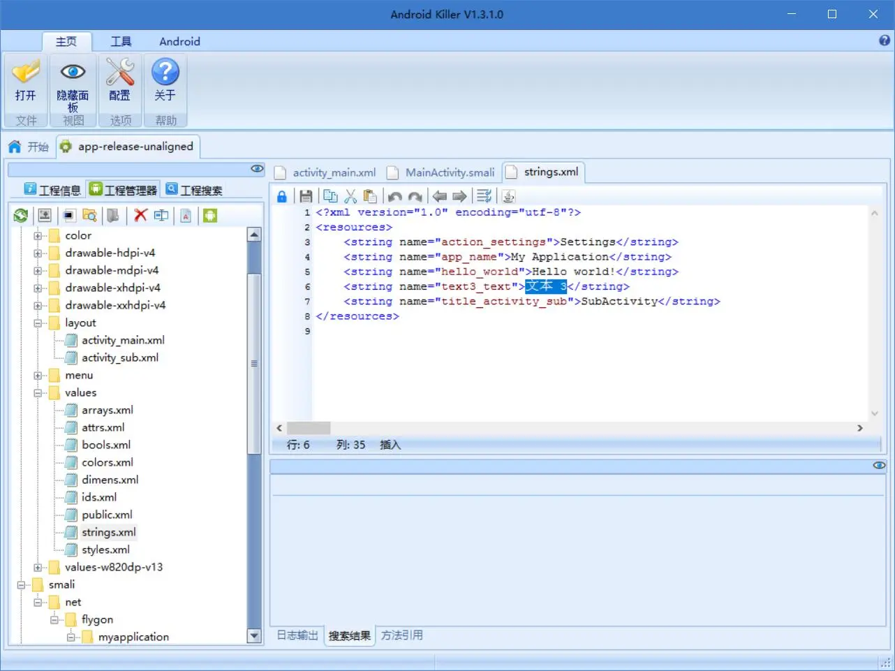 下面我们将其载入 Android Killer。完成后,在文本搜索框中搜索文本 1。