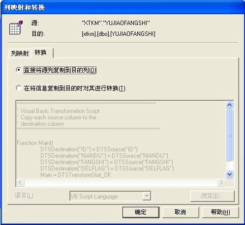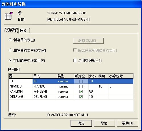 选择你要导入的表,“转换”一栏有个“ ”按钮,点击,进入“列映射和转换”窗口,如下图: