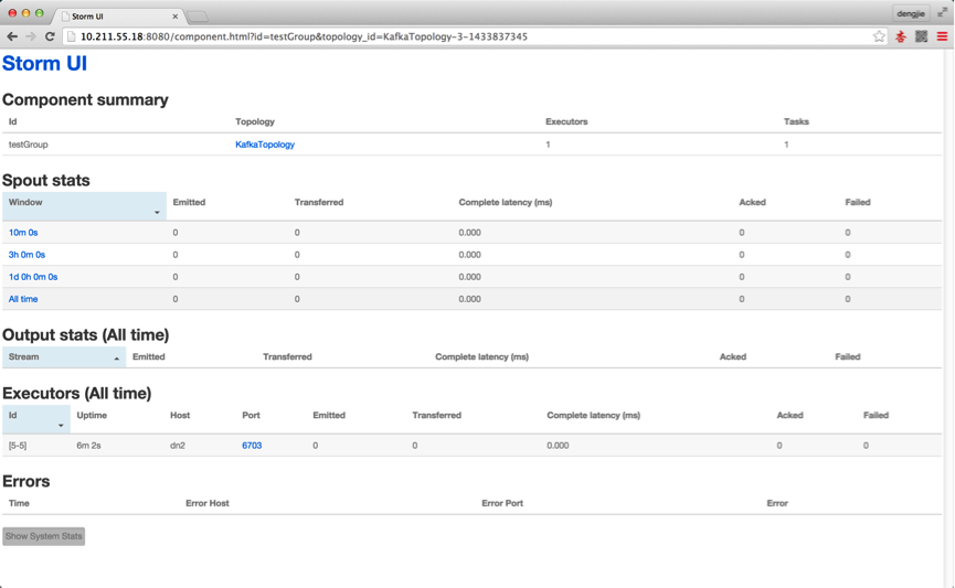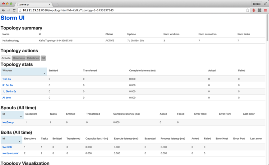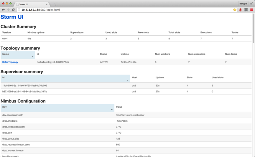 由于,集群我做过测试,提交过Topology,所以截图中会有提交记录,从上面的dn2节点的进程中也可以看出,有相应的worker进程,若是首次安装,未提交任务是不会有对应的显示的,下面附上Storm UI中相关的截图预览,如下图所示: