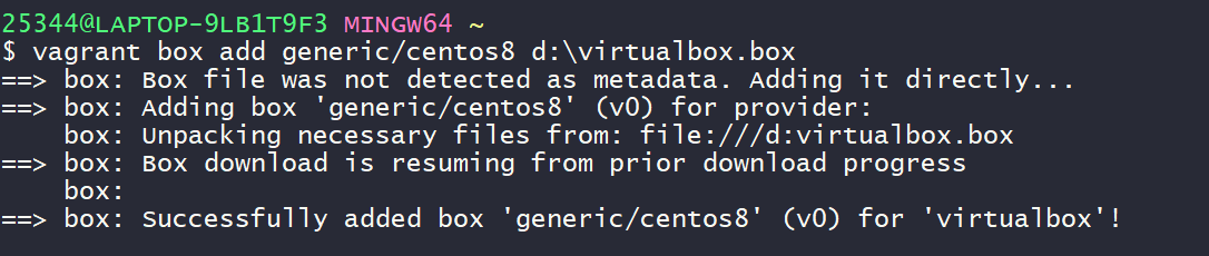 vagrant box add generic/centos8 d:\virtualbox.box