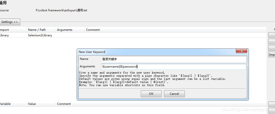 在建立的“通用” 节点点击右键,选择【New User Keyword】,建立新关键字“登录关键字”