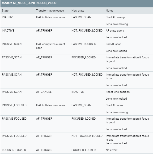 在AF,AE或AWB模式之间切换总是将算法的状态重置为INACTIVE。同样,如果CONTROL_MODE == USE_SCENE_MODE,则在CONTROL_MODE或CONTROL_SCENE_MODE之间进行切换会将所有算法状态重置为INACTIVE。