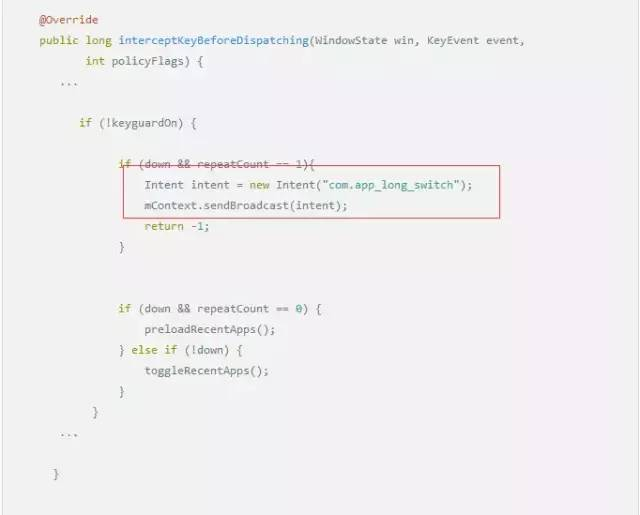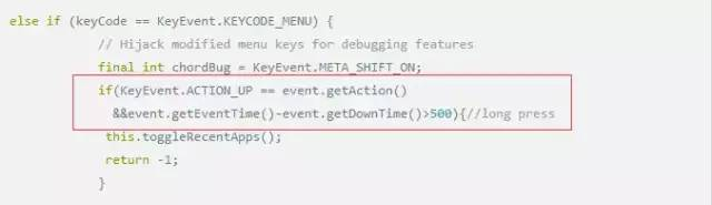 如果想调出最近任务列表,需要拦截menu的事件,在PhoneWindowManager的interceptKeyBeforeDispatching 中处理即可