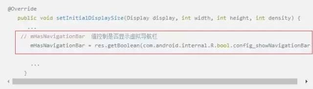如果上面两个修改都不生效(搜索关键字config_showNavigationBar、qemu.hw.mainkeys),请在PhoneWindowManager 查看setInitialDisplaySize方法中mHasNavigationBar 的值是否被写死,true表示会显示、false表示不显示导航栏。
