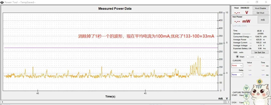 优化后电流由 133mA 下降到100mA, 1秒钟一个的异常波形也消失了。