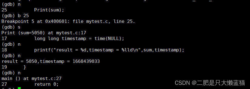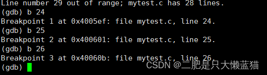 通过指令:b {行号}即可打上断点,其中b是break的简写