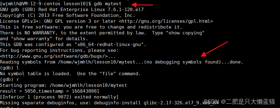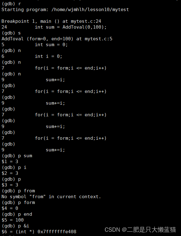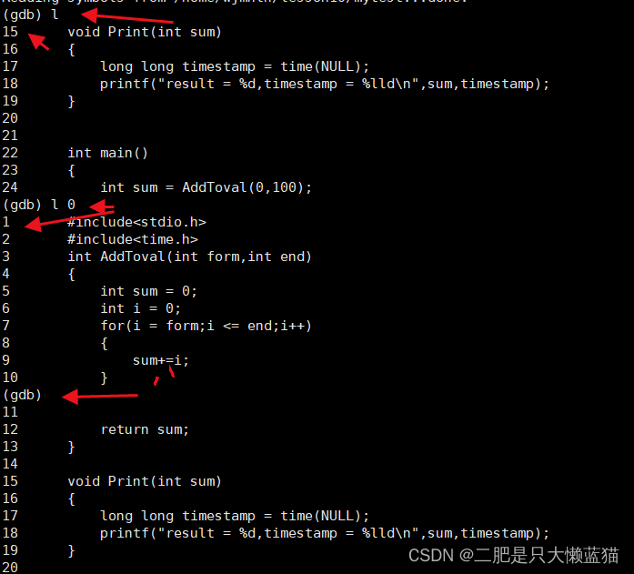 解释:第一个输入L,不从0行开始显示。输入l 0,则从0行开始。按下空格,gdb会记住前一次的行数,会从下一行开始,也就是说,只需要l一次,那么剩下的直接按回车就行了。