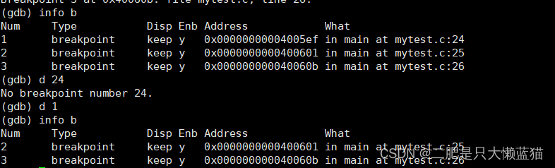 去除断点:使用d {断点编号},注意是编号,不是断点的行号,d是delete的简写。