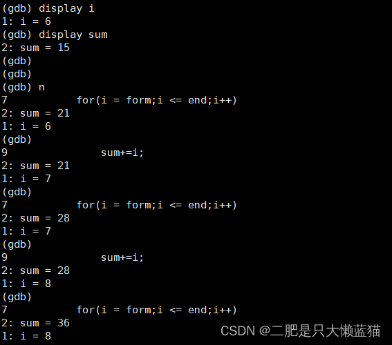 不想要常显示的时候,使用指令undisplay {行号},比如:undisplay 2,就是把sum去掉
