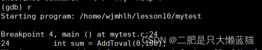 打上断点后,通过指令r,进行跑程序,会在断点除停下来,r的简写是run
