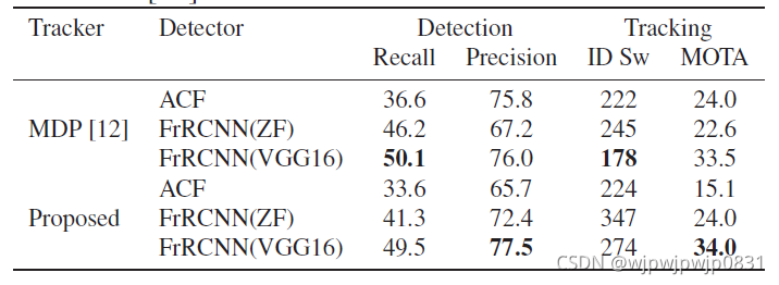 对于已有的跟踪器(MDP)和本文提出的跟踪器,FrRCNN都有着最好的表现,如下表所示:
