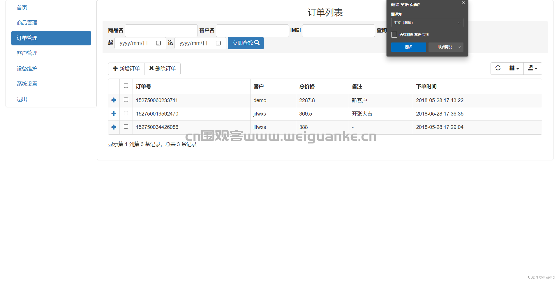 订单管理 (订单号,客户,总价格,备注,下单时间)