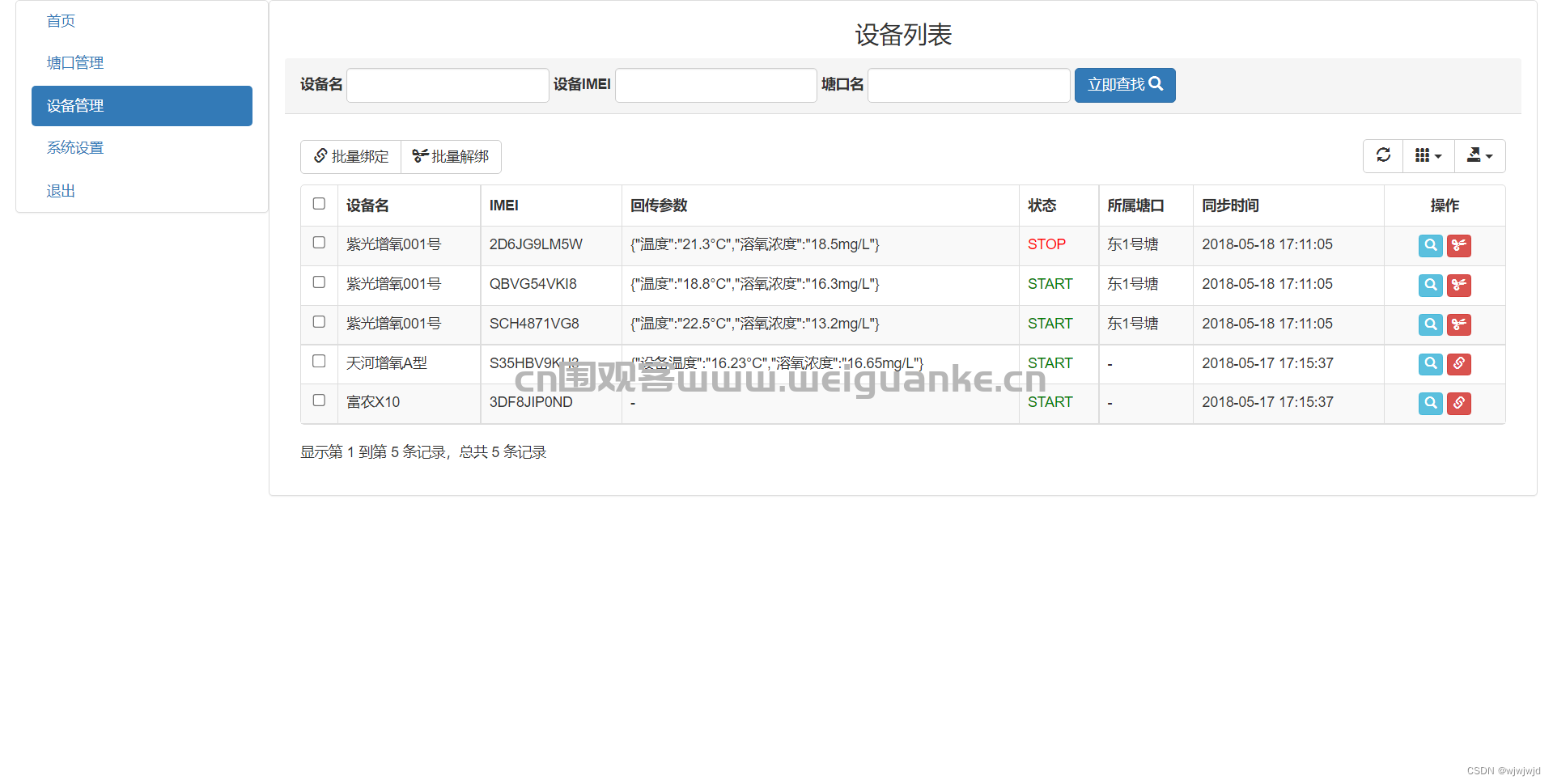 设备管理 (设备名,IMEI,回传参数,状态,所属塘口,同步时间,操作)
