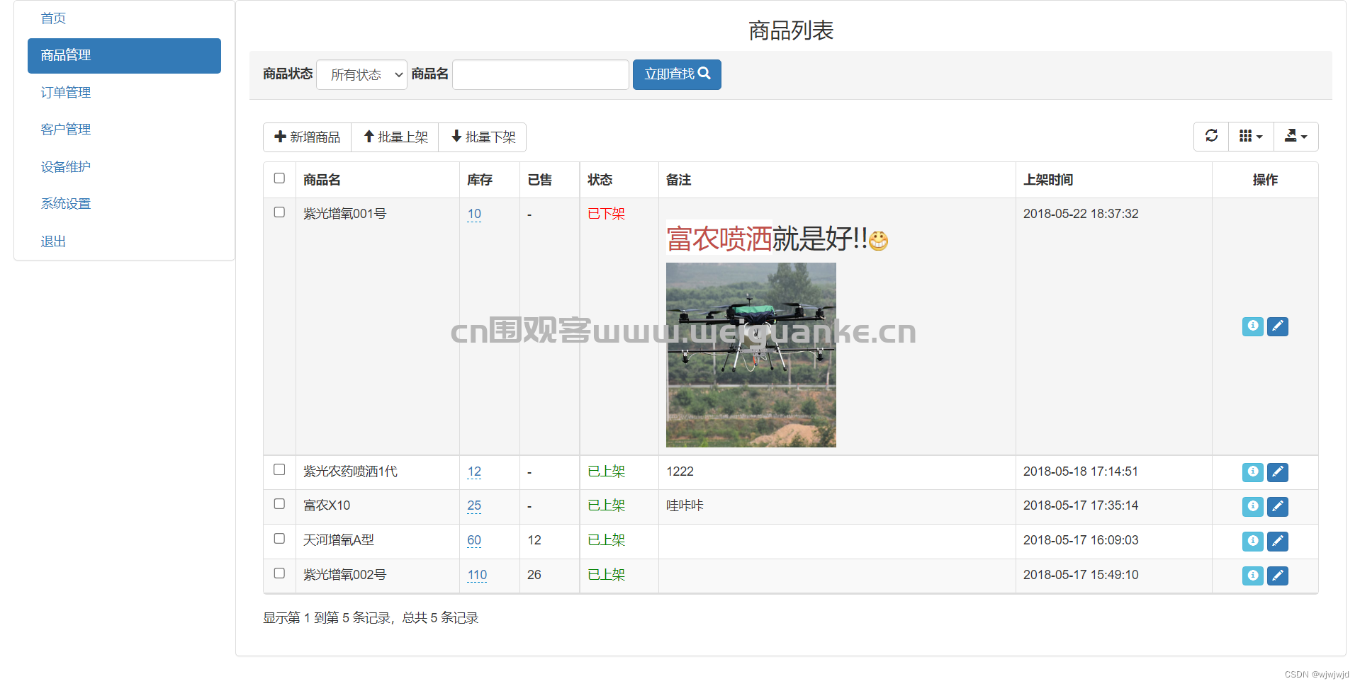 商品管理(商品名,库存,已售,状态,备注,上架时间,操作)