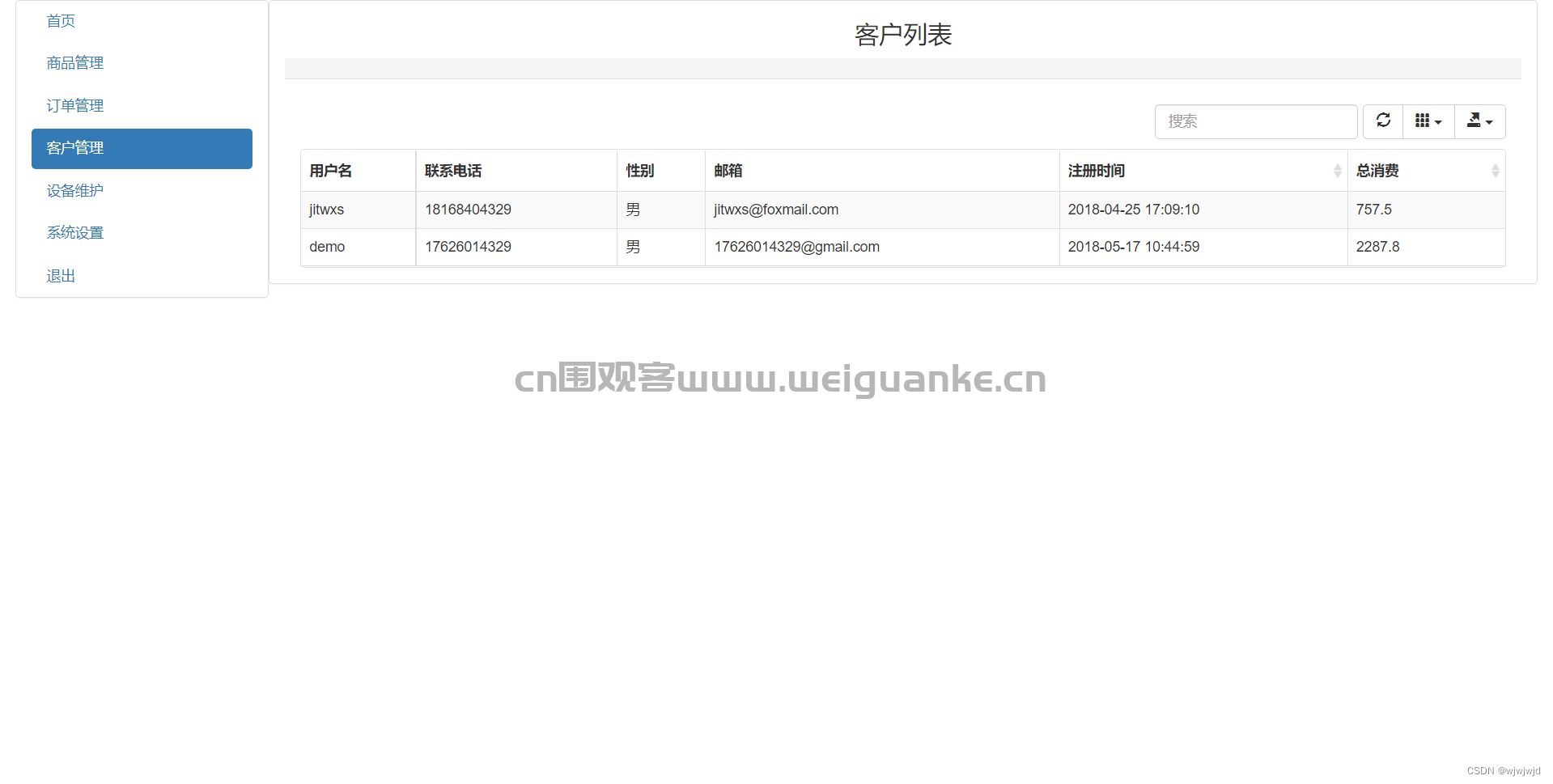 客户管理 (用户名,联系电话,性别,邮箱,注册时间,总消费)