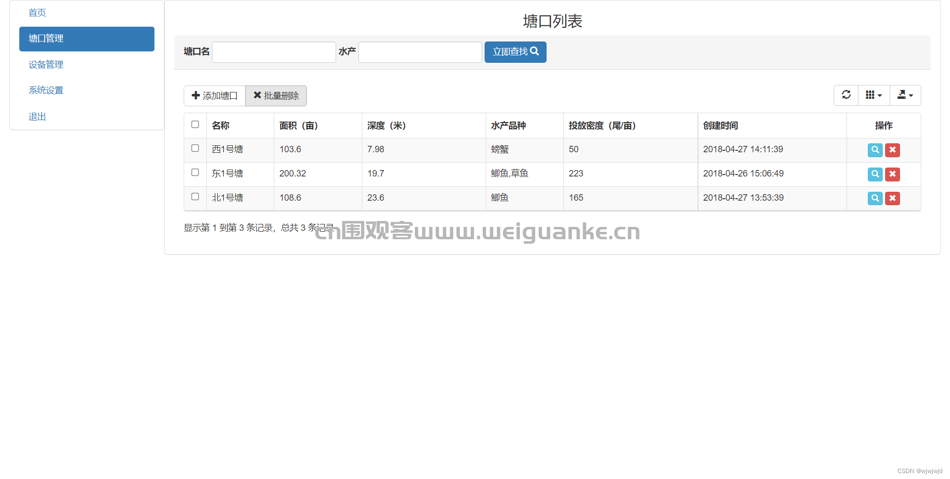塘口管理 (名称,面积(亩),深度(米),水产品种,投放密度(尾/亩),创建时间,操作)