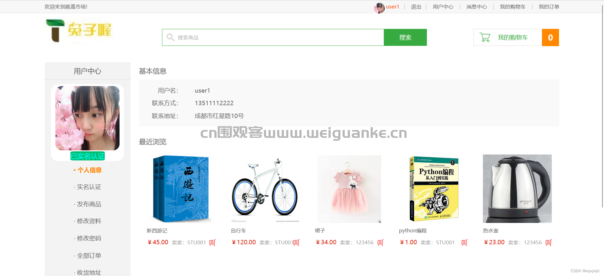 用户中心:支持用户个人信息,收货地址,修改密码,发布商品,修改个人信息,实名认证等信息的更新,商品加入购物车,订单生成。