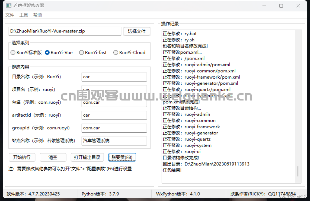 1. 一键修改:支持修改[RuoYi](https://gitee.com/y_project/RuoYi)、[RuoYi-Vue](https://gitee.com/y_project/RuoYi-Vue)、[RuoYi-fast](https://gitee.com/y_project/RuoYi-fast)、[RuoYi-Cloud](https://gitee.com/y_project/RuoYi-Cloud)四个系列的所有版本及其他扩展项目的包名、项目名、配置、其他关键字等
