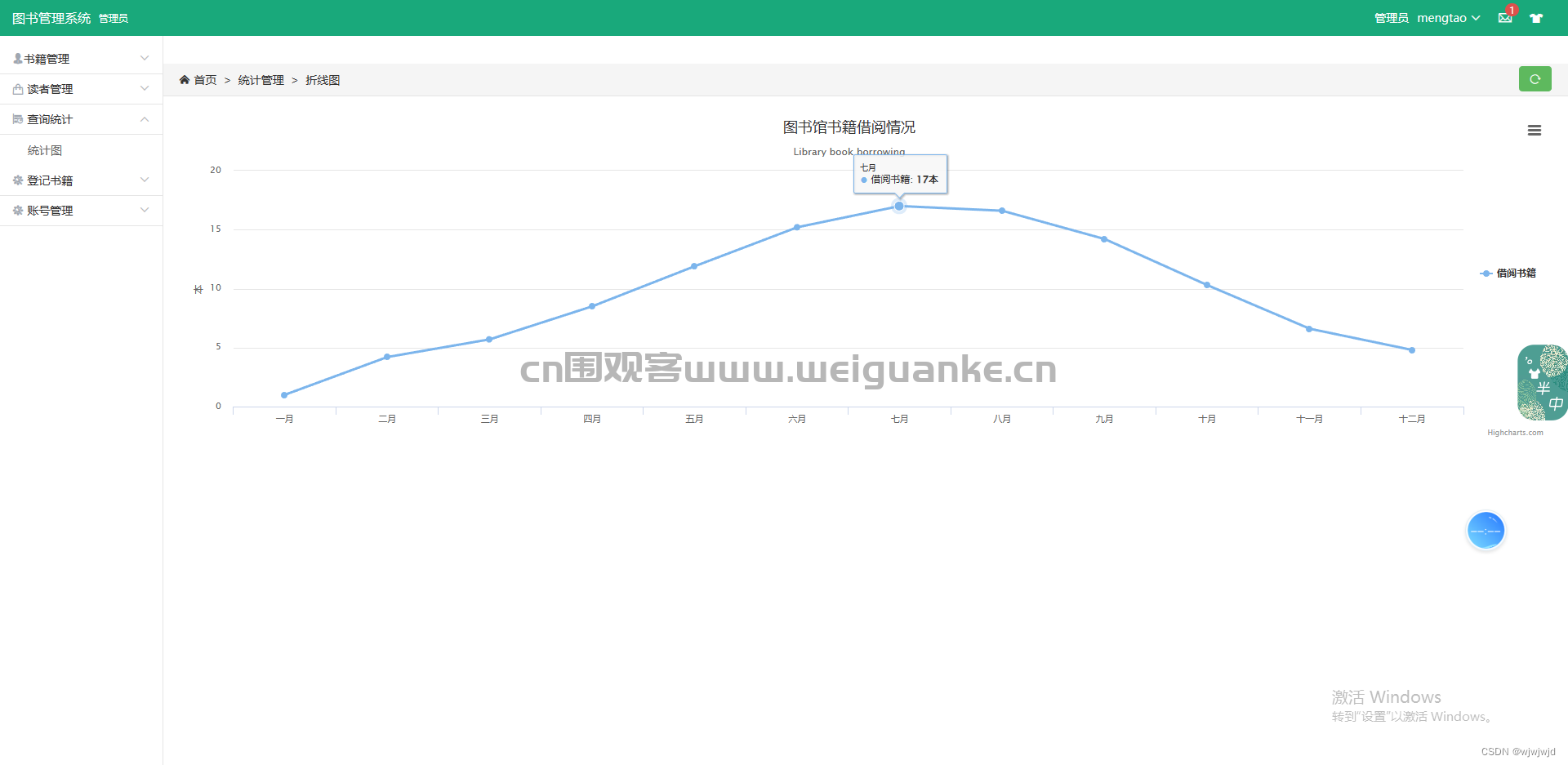 5.查询统计:统计图(图书馆书籍借阅情况折线图)