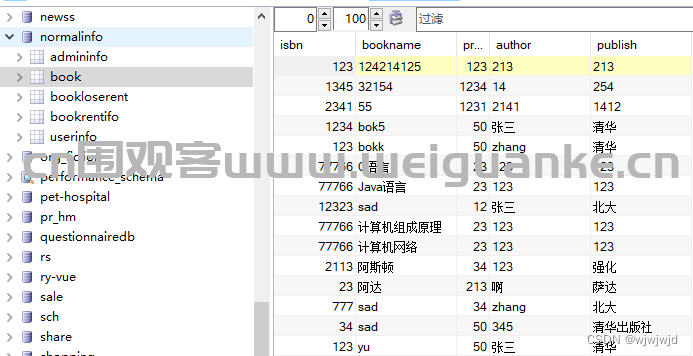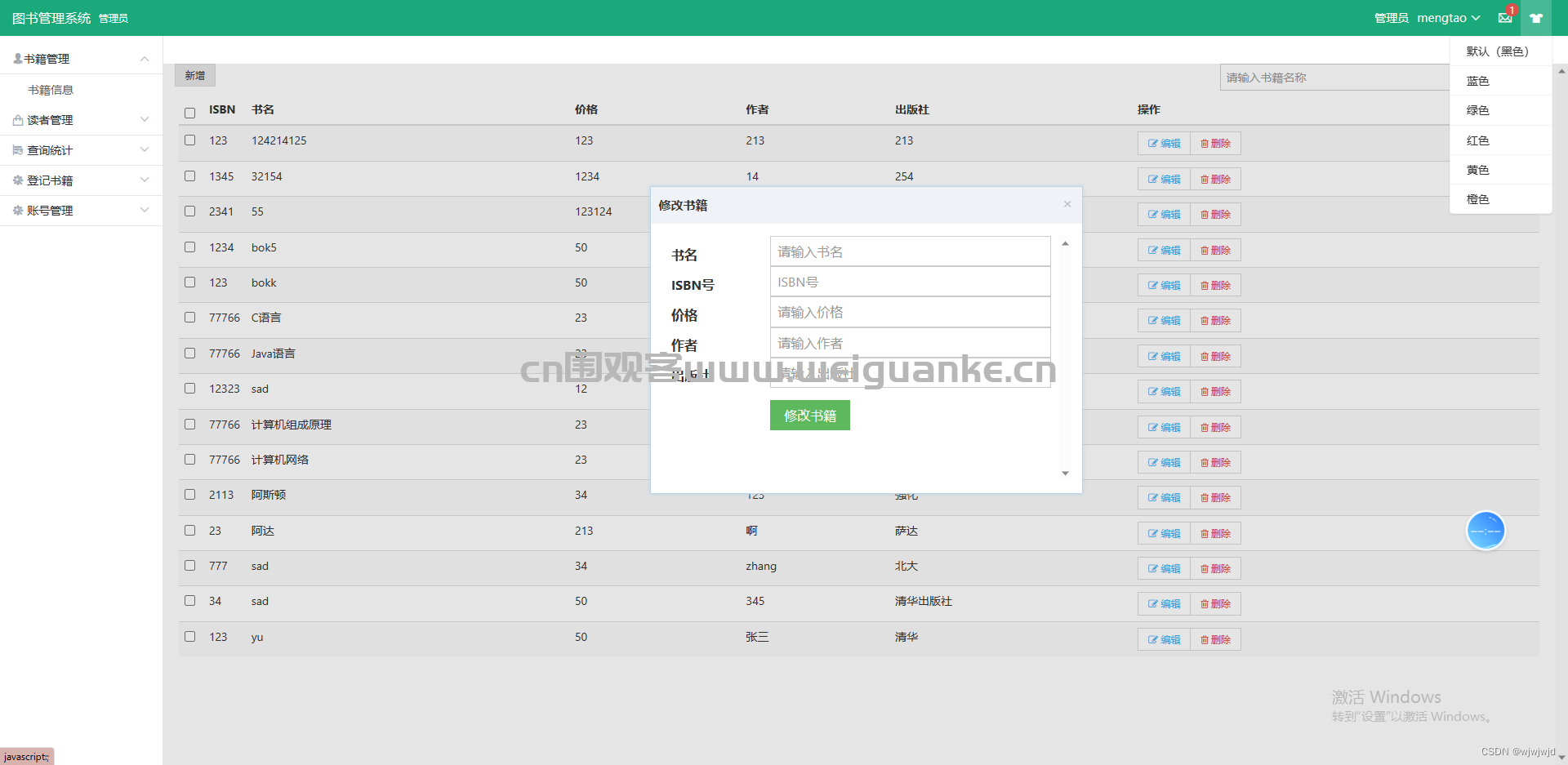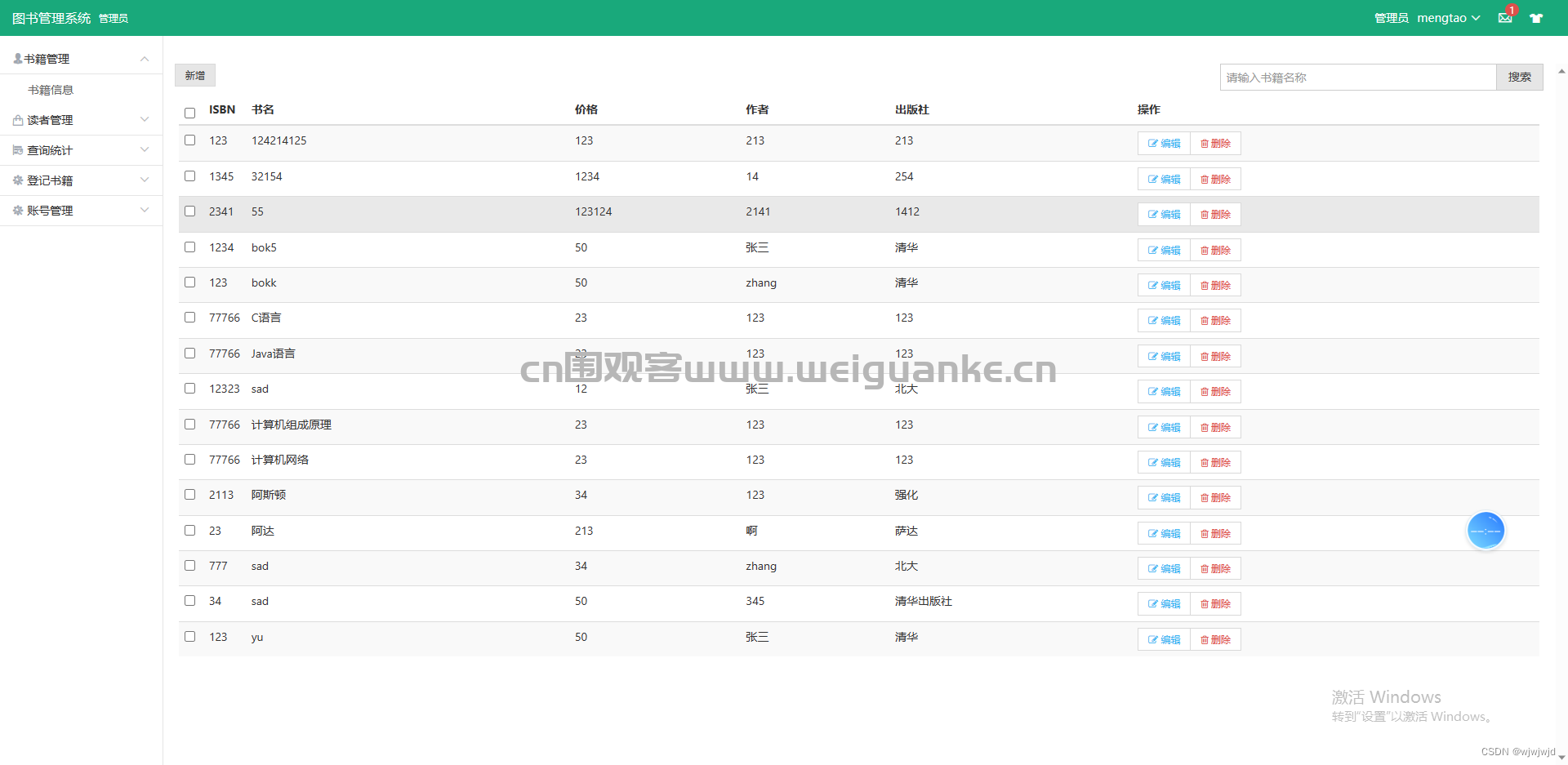 3.书籍管理:书籍信息(ISBN,书名,价格,作者,出版社,操作)