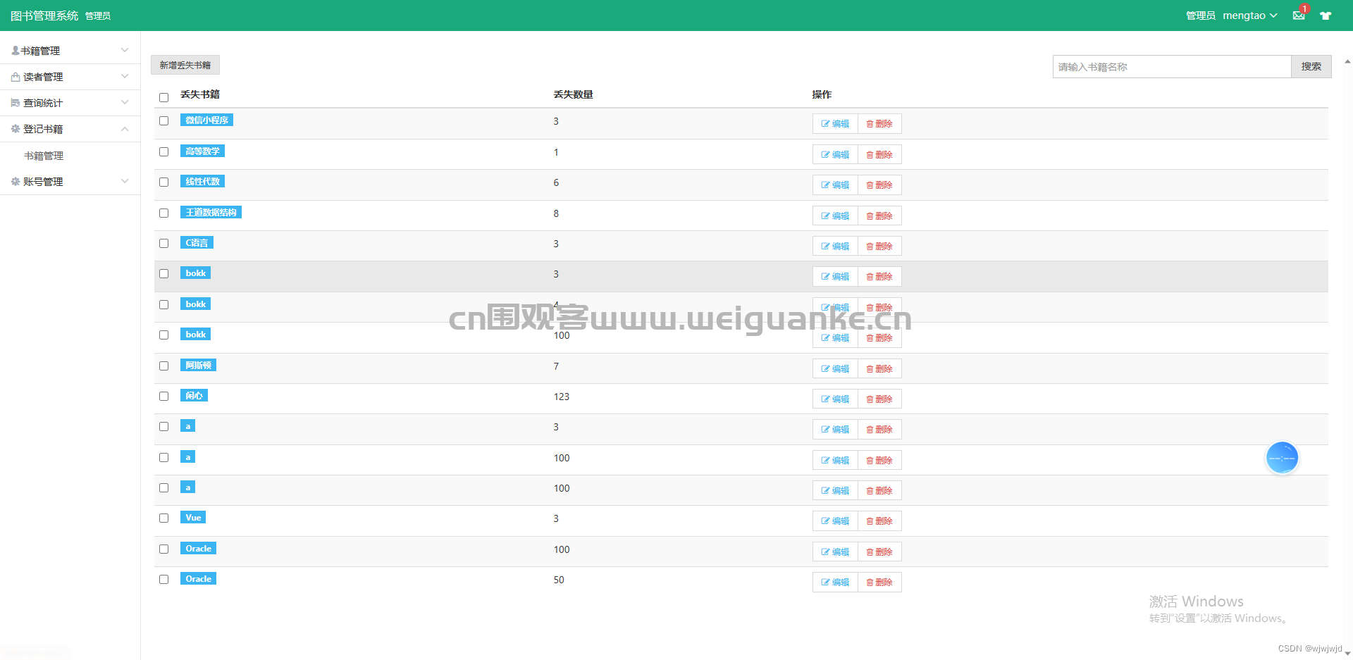 6.登记书籍:书籍管理(丢失书籍,丢失数量,操作)