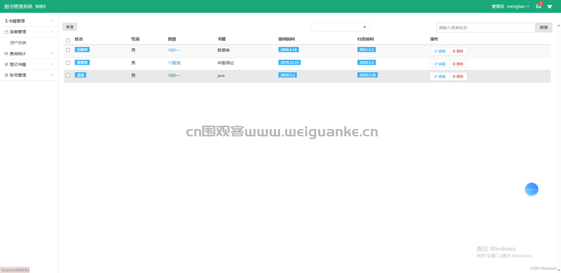 4.读者管理:用户列表(姓名,性别,班级,书籍,借阅时间,归还时间,操作)