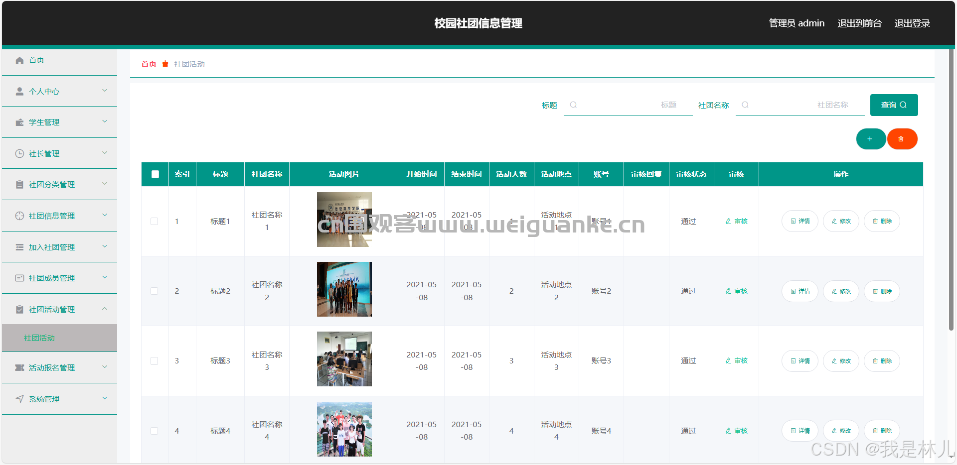 社团活动:管理员可以创建、编辑、删除、审核社团活动。