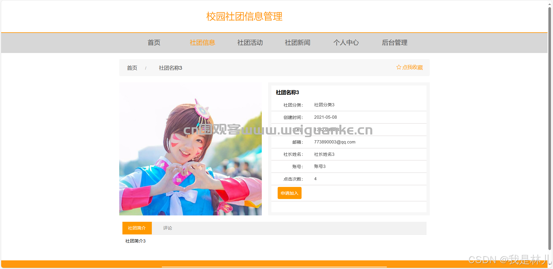 社团信息:用户可以查看社团的详细信息。用户可以加入感兴趣的社团,并提交加入申请。