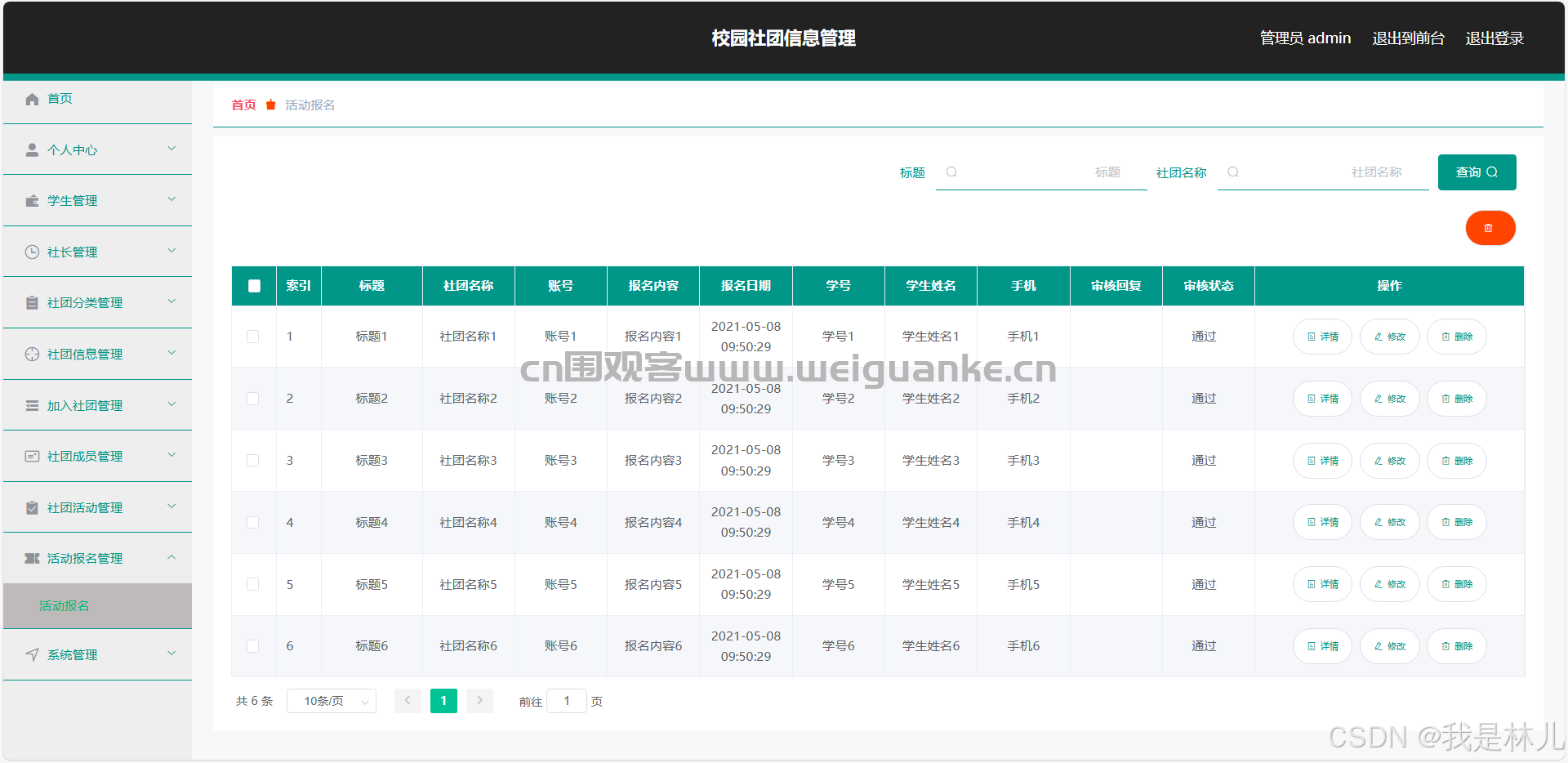 社团报名:管理员可以查看和管理社团活动的报名信息。