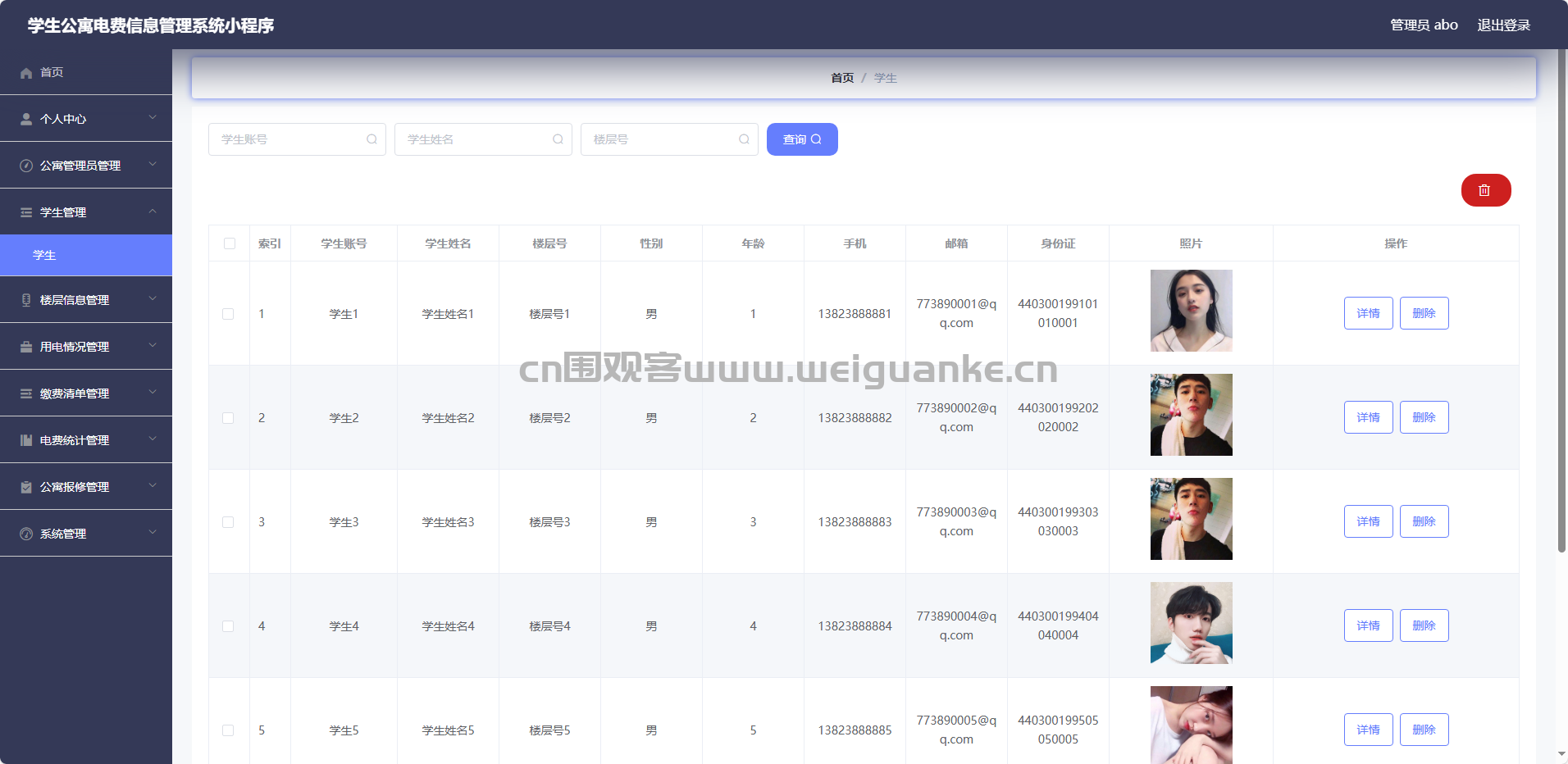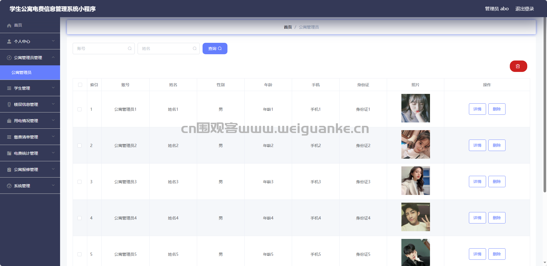 公寓管理员管理:查看所有公寓管理员信息,包括姓名、工号、联系方式等。可对公寓管理员进行添加、删除、修改等操作。