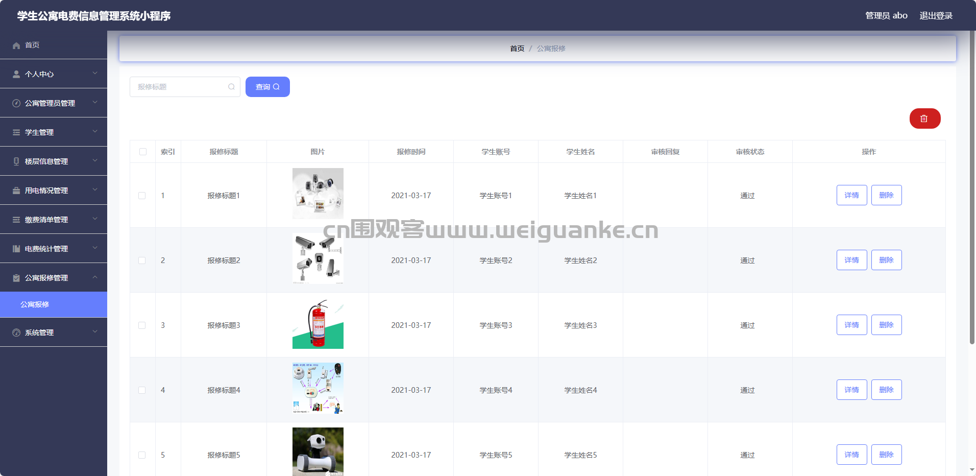 公寓报修管理:查看全校的报修申请,对报修情况进行统计分析。
