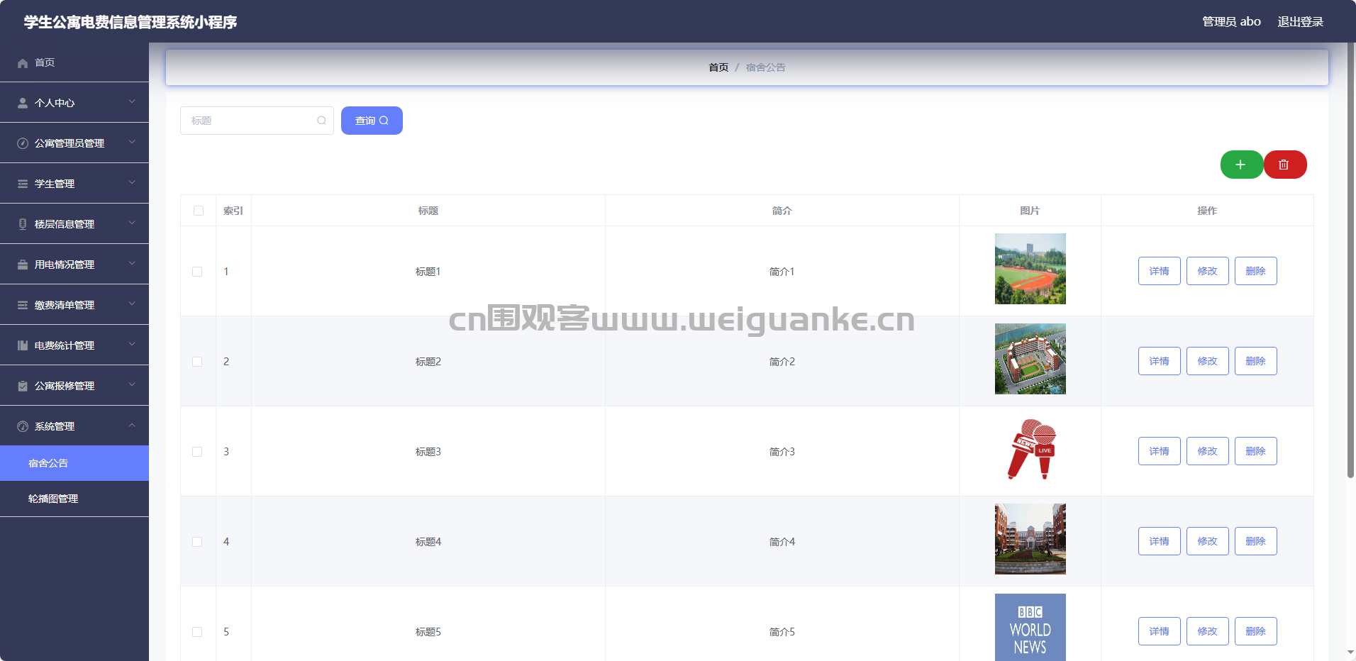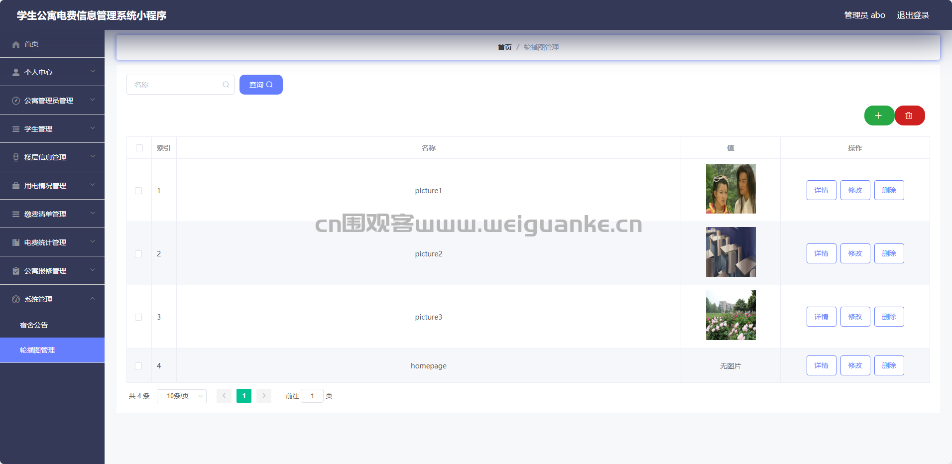 轮播图管理:上传和管理首页轮播图,展示公寓文化、活动信息等。