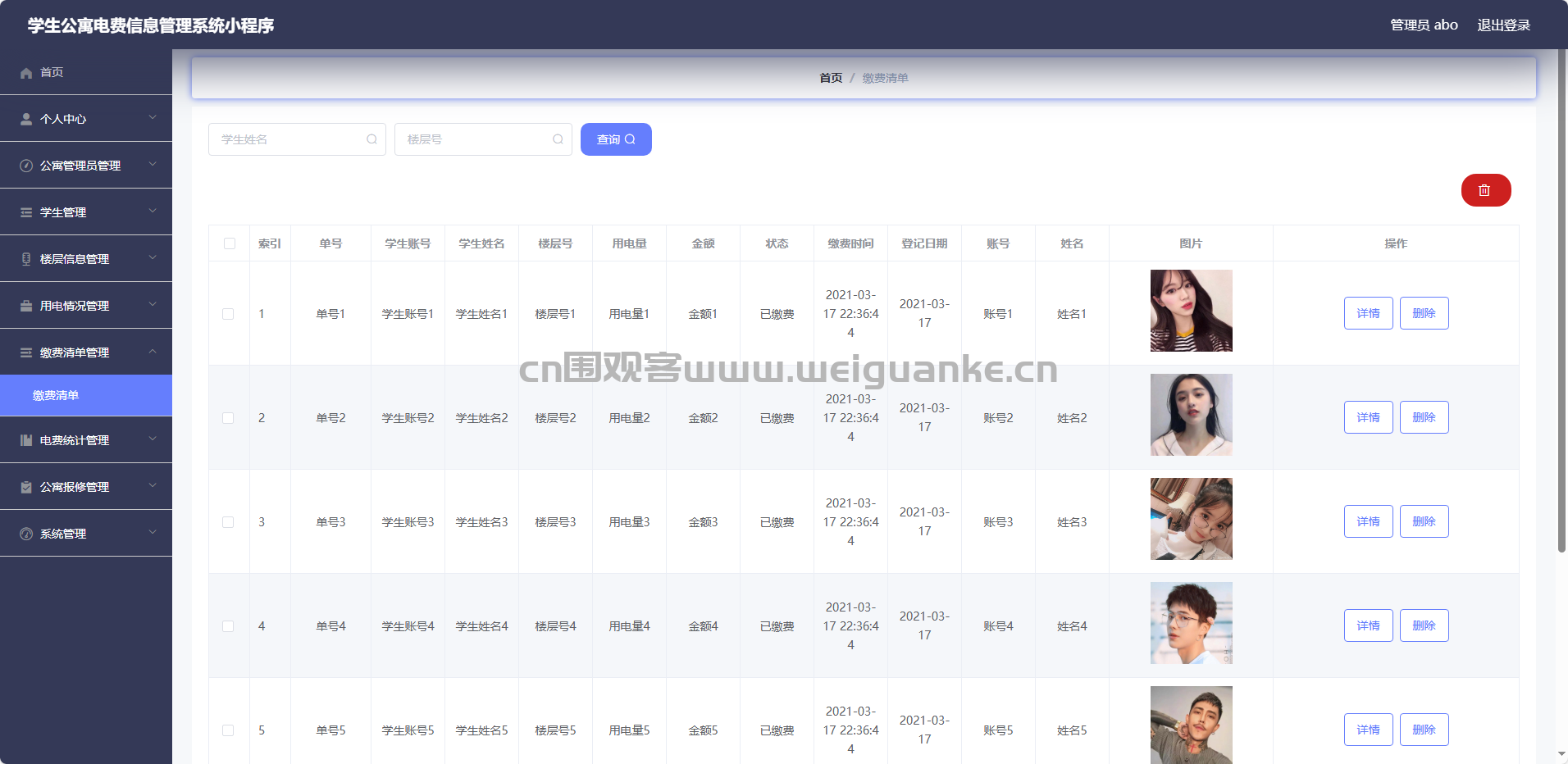 缴费清单管理:查看全校学生的缴费记录,统计缴费总额、未缴费人数等信息。可对缴费记录进行查询、导出操作。