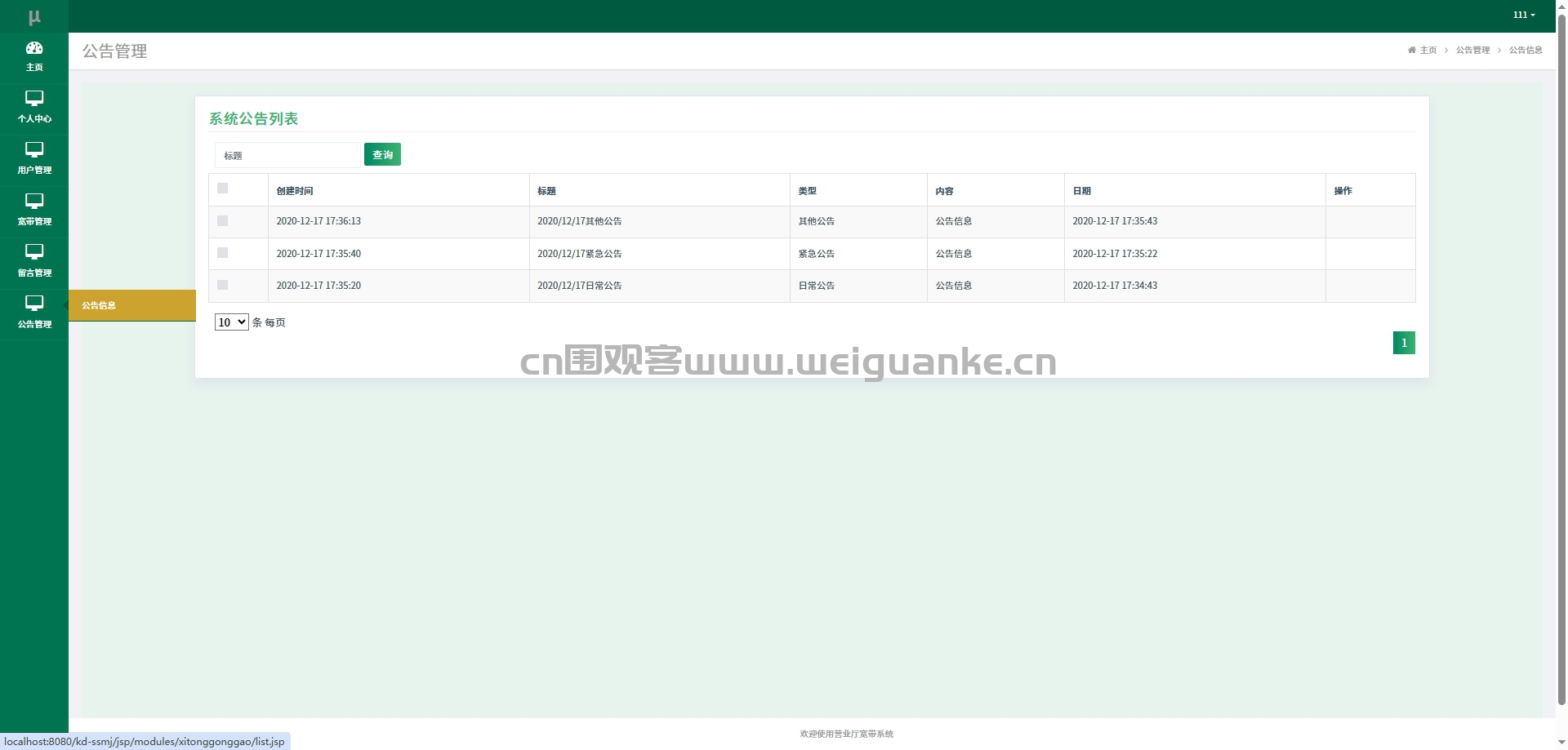 用户浏览系统发布的公告通知