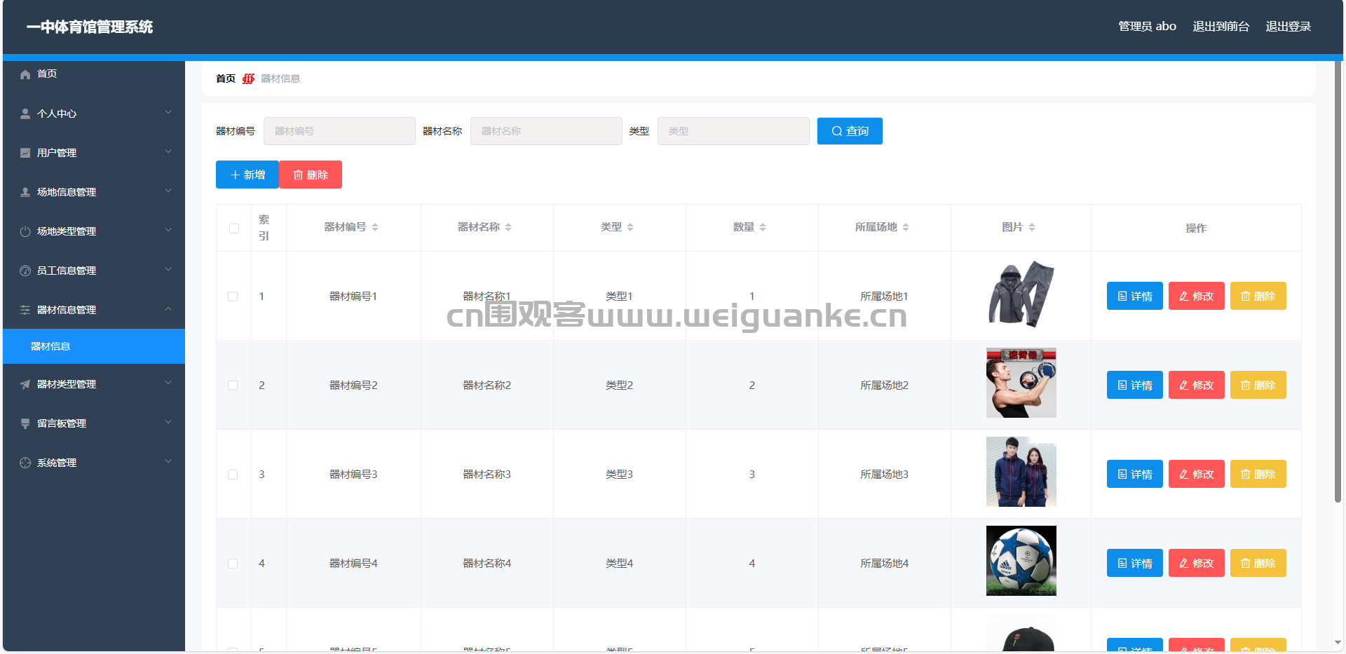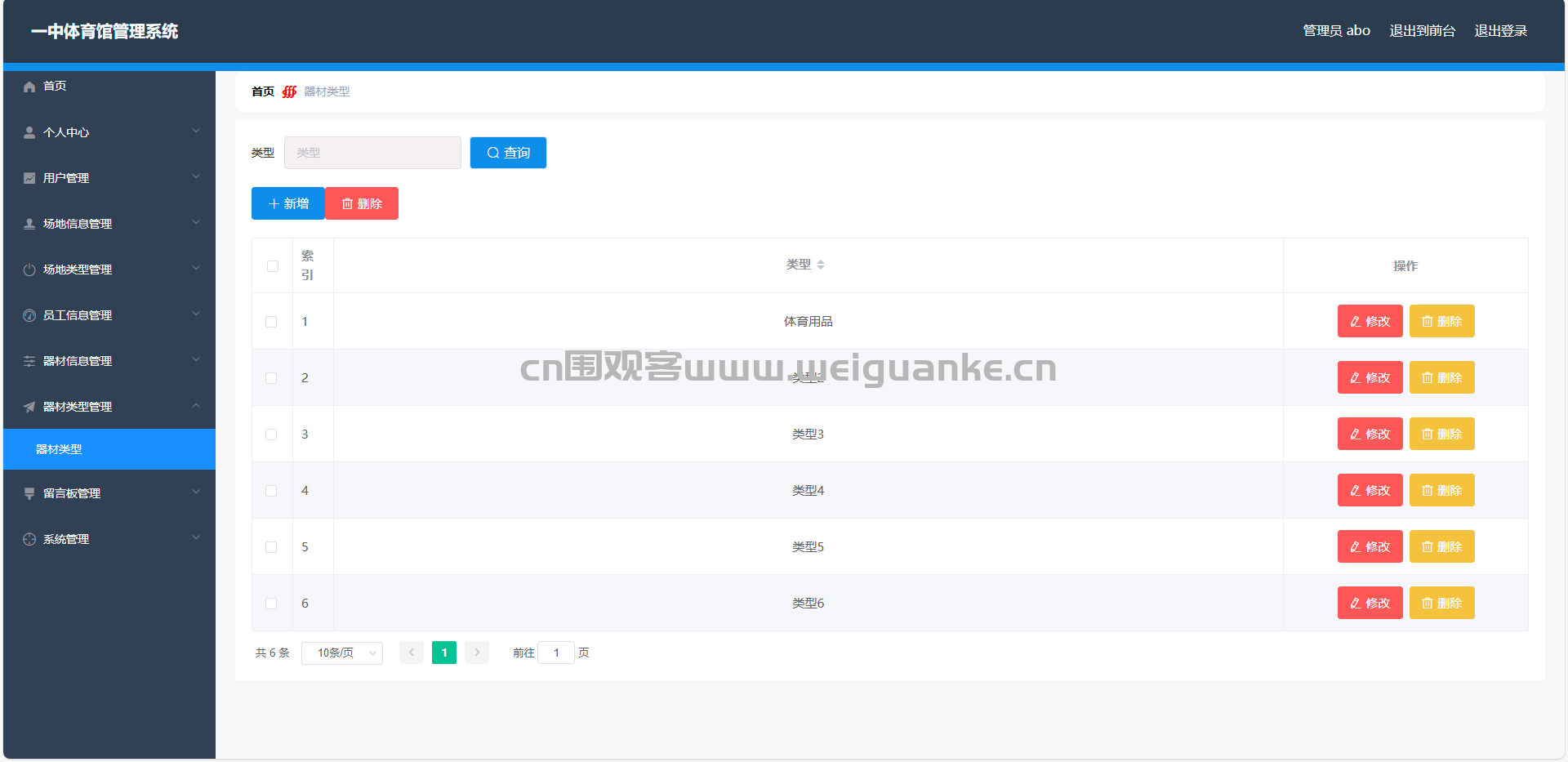 器材类型管理:管理员可以添加、修改和删除器材类型,维护器材分类。