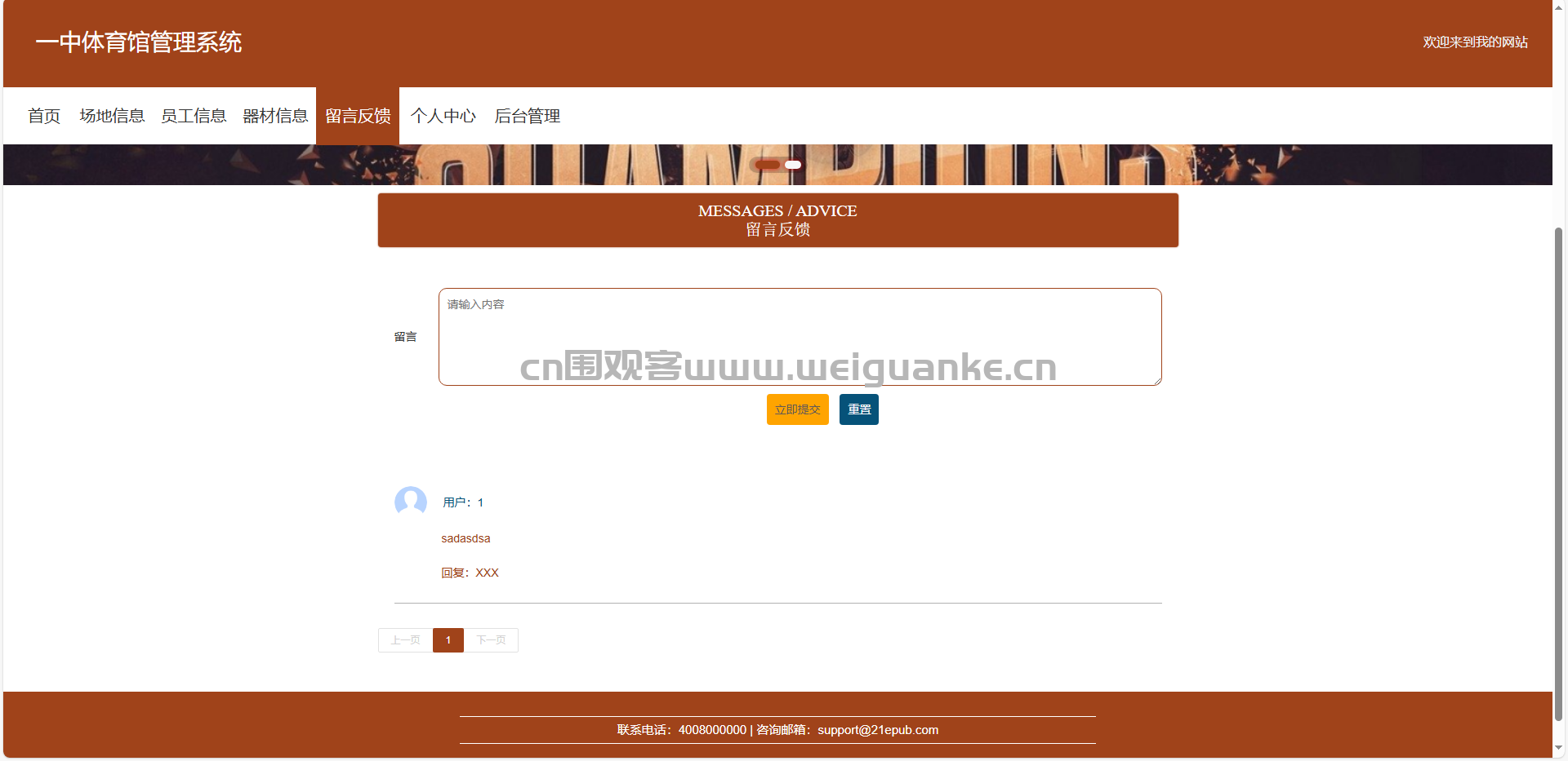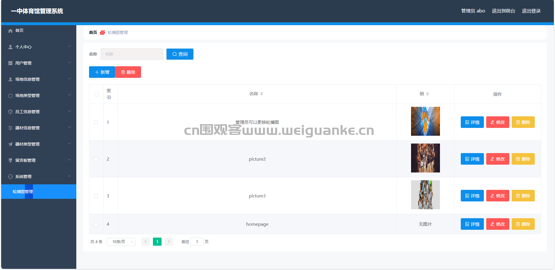 轮播图管理:管理员可以上传、修改和删除轮播图,展示体育馆的活动或宣传信息。
