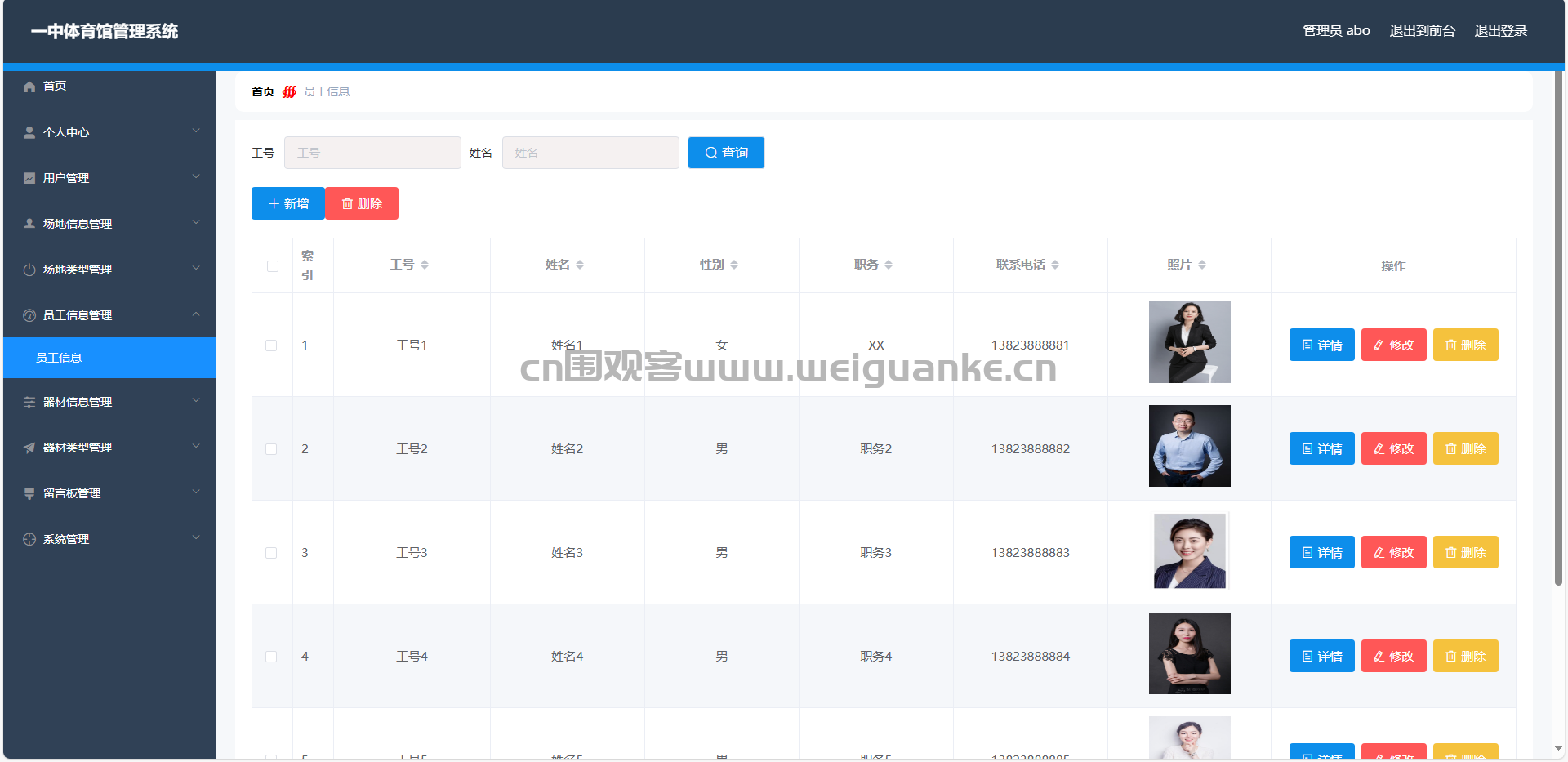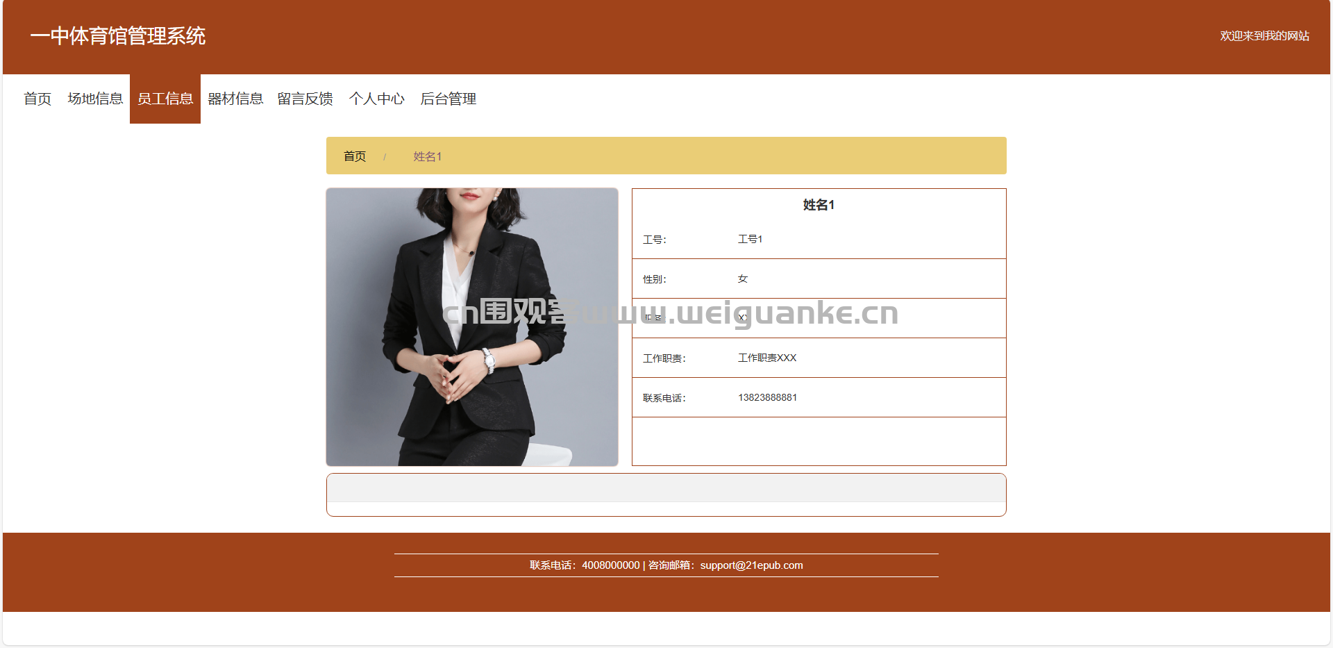 员工信息:展示体育馆员工的基本信息和工作评价,方便用户联系和了解员工服务质量。