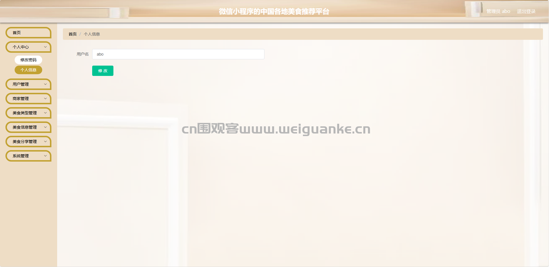 个人信息:管理员可以查看和修改自己的基本信息。