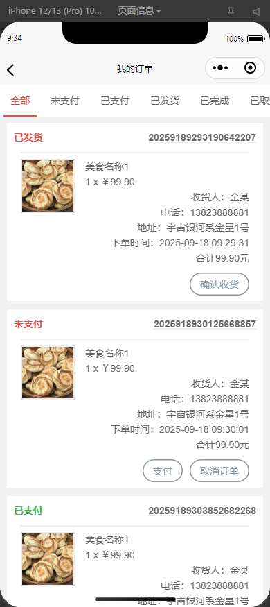 我的订单:展示用户的订单列表,包括订单状态、金额等。