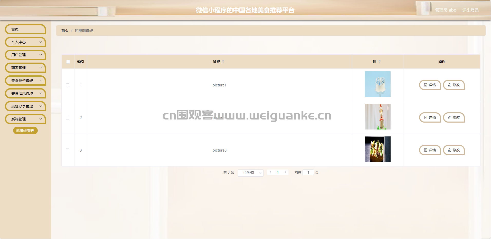 轮播图管理:管理员可以上传、修改、删除轮播图,用于首页展示。