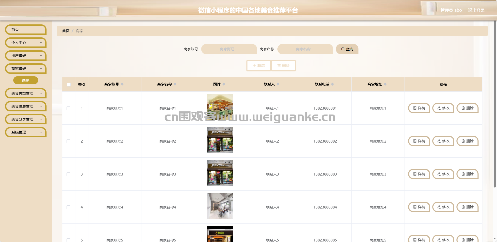 商家管理:管理员可以审核商家信息,管理商家账号等。