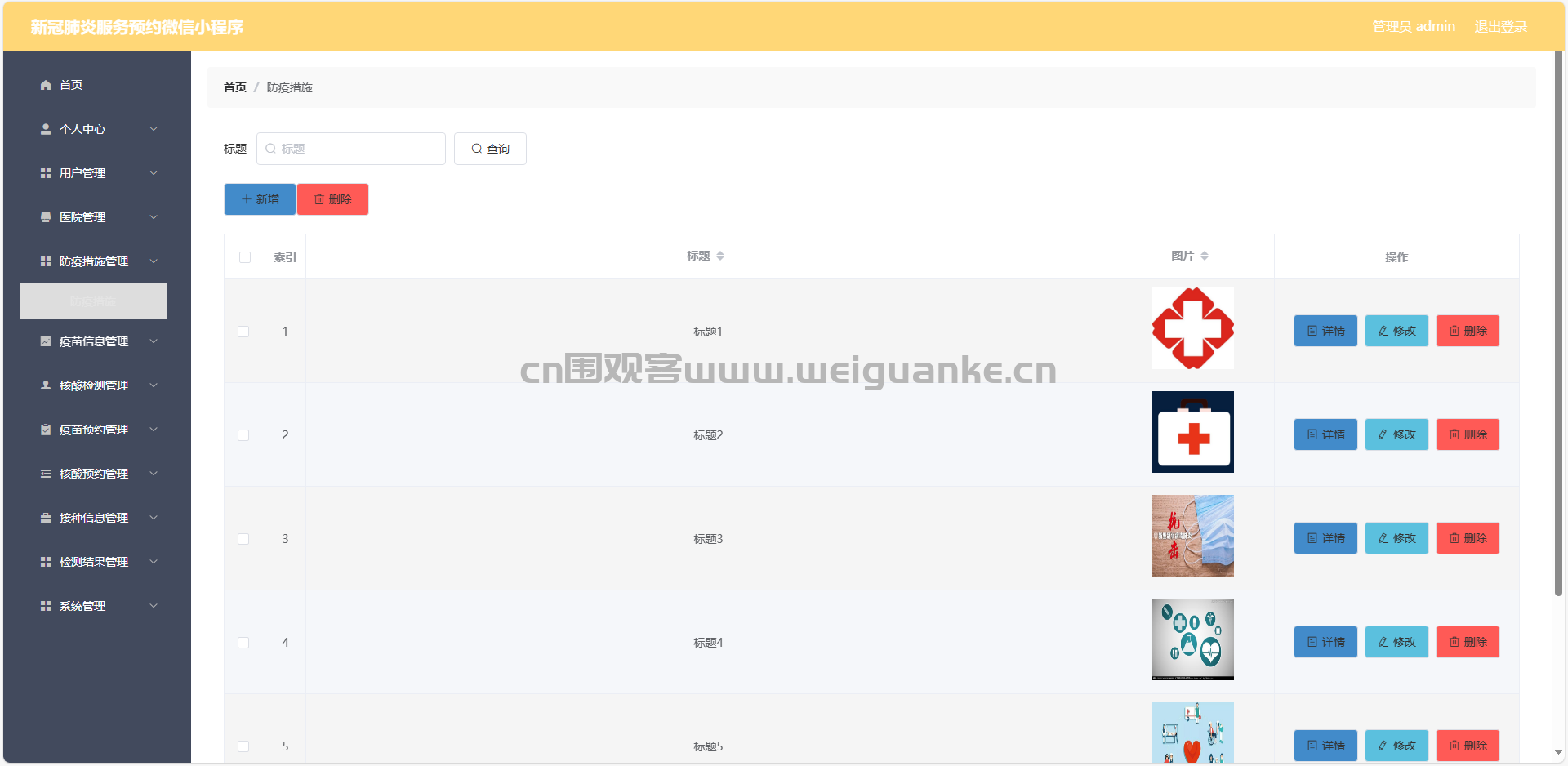 4.防疫措施管理:查看、添加、编辑、删除防疫措施信息