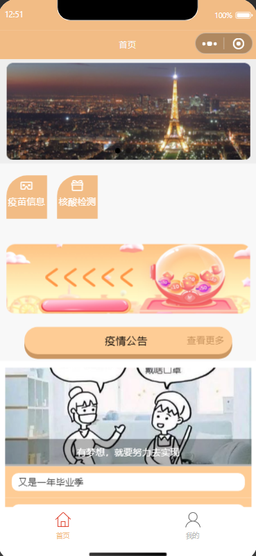 2.首页:查看系统概览信息,查看疫苗,核酸信息进行预约,查看防疫,公告信息