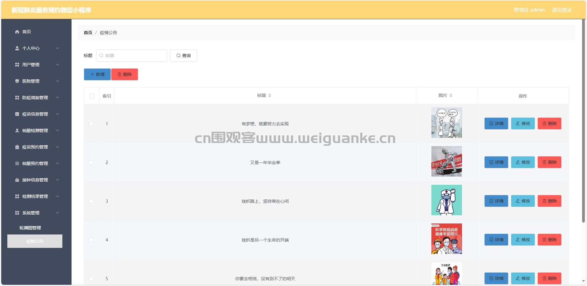 11.疫情公告管理:查看、添加、编辑、删除疫情公告信息