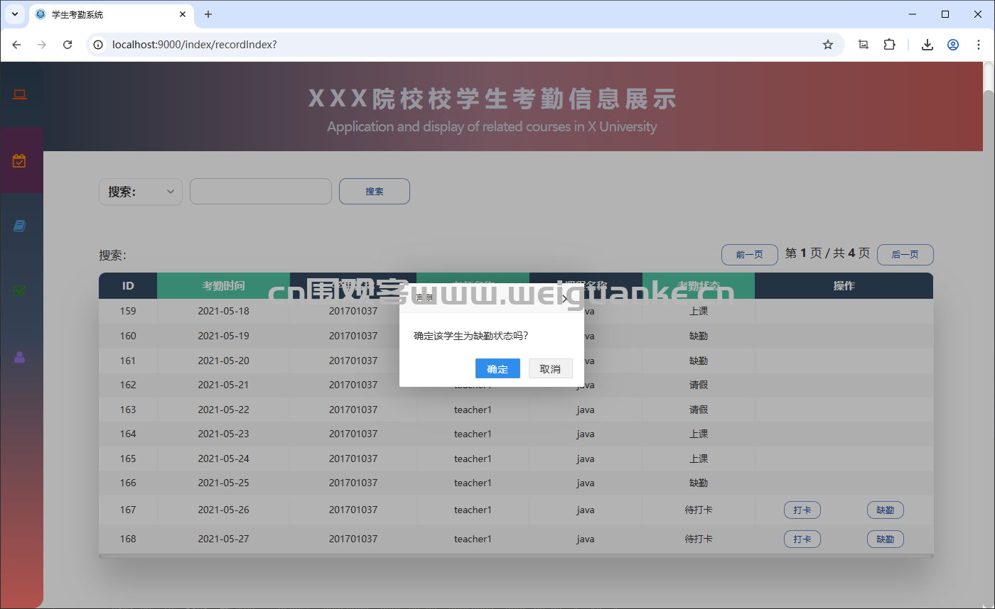 显示学生的考勤记录,包括考勤时间、学生名称、课程名称、考勤状态和操作选项。