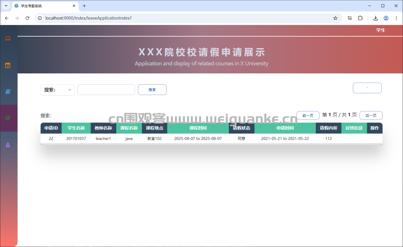 展示学生的请假申请信息,包括申请ID、学生名称、教师名称、课程名称、课程地点、请假状态、申请时间和请假内容。