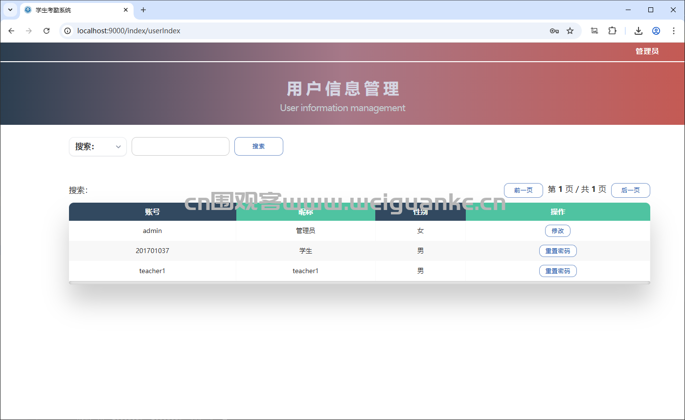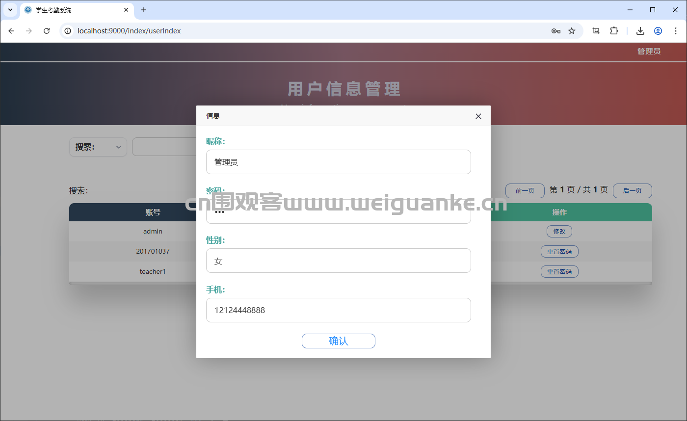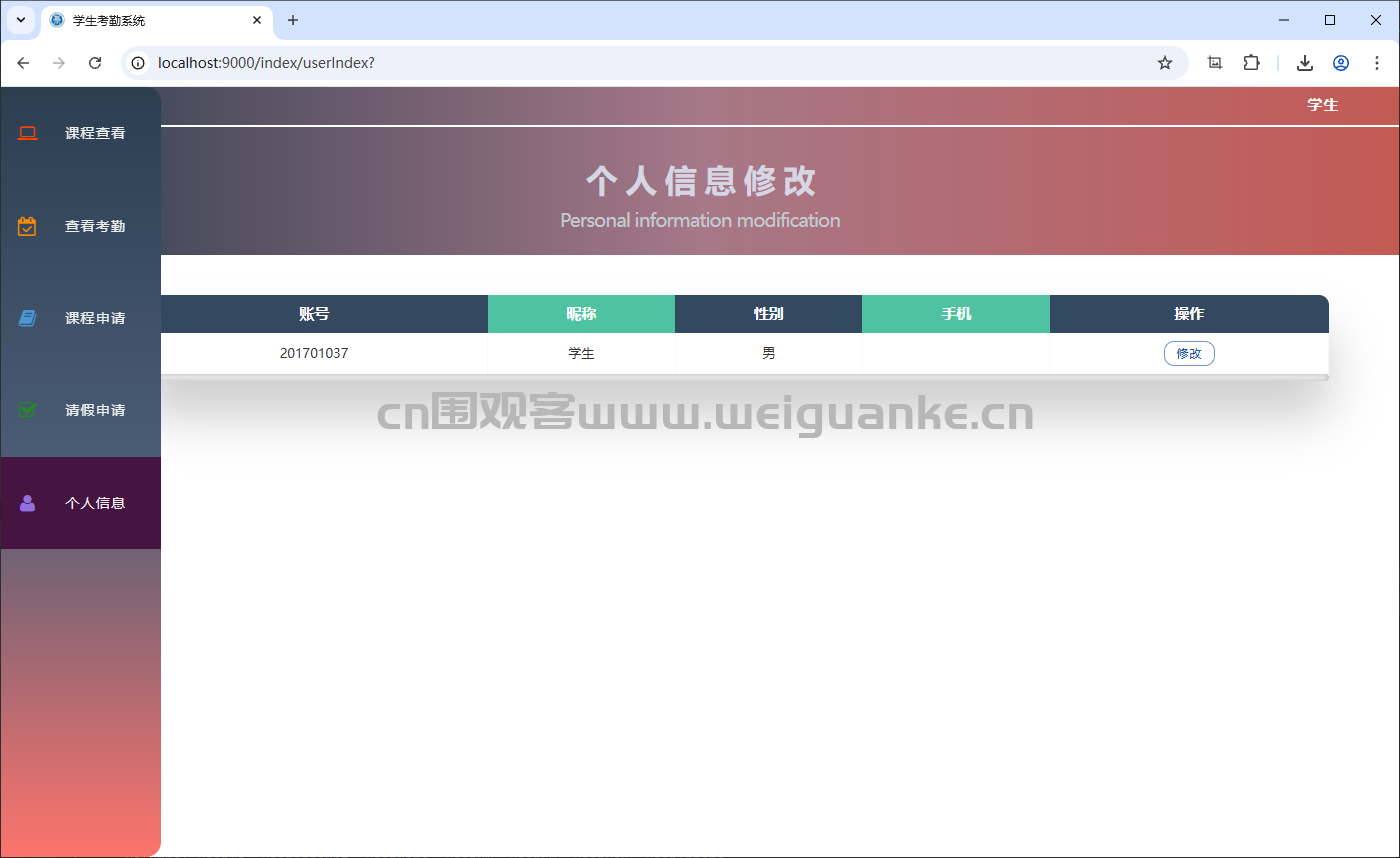 用户可以修改个人信息,包括昵称、密码、性别和手机。
