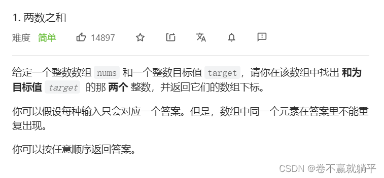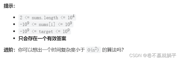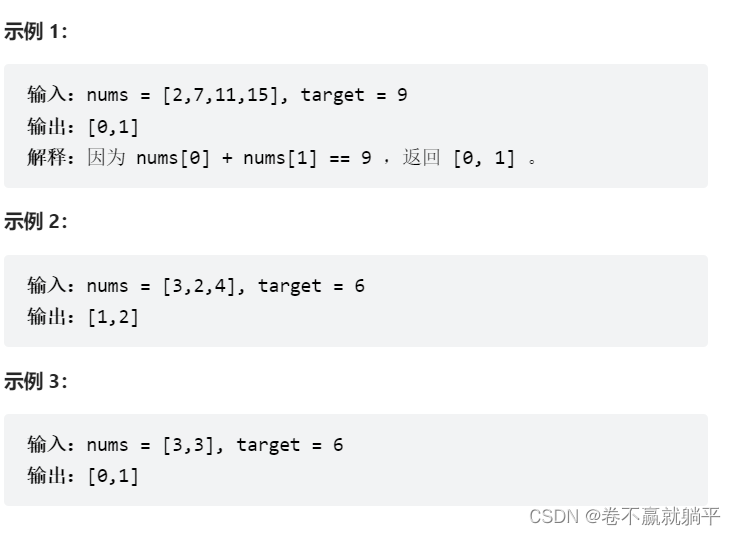 哈希查找。我们可以先new一个hashmap,然后将数组对应的元素和下标存储在哈希map中,然后只需要遍历一遍哈希表就可以找到两数之和为target的下标了。时间复杂度为O(N),空间复杂度也为O(N)。代码如下: