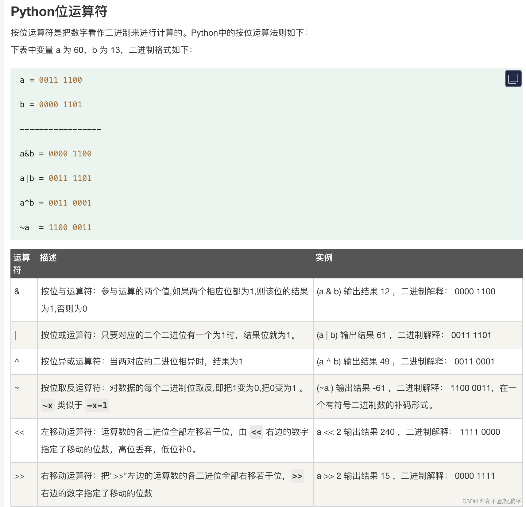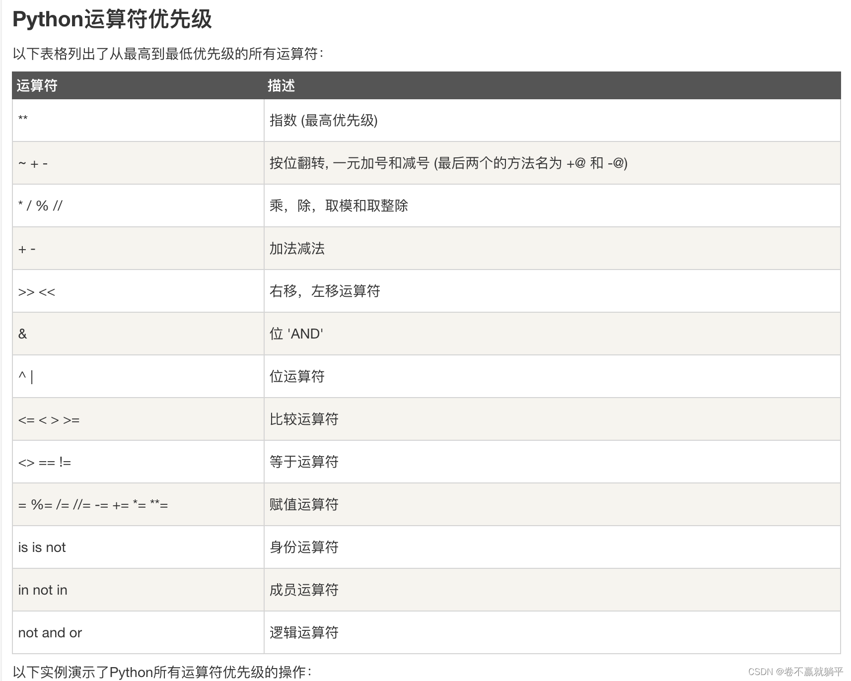 本文介绍了Python中的算术、比较、赋值、位、逻辑、成员和身份运算符,以及它们的用法示例和运算符优先级,同时提到了关于变量内存地址分配的问题。