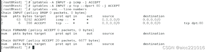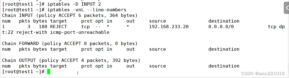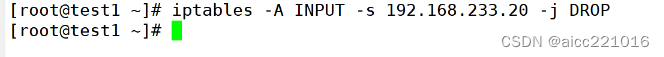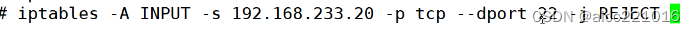 -A指定链进行追加 -s指定ip地址 -p指定协议 --dport22:指定22端口 -j指定控制类型
